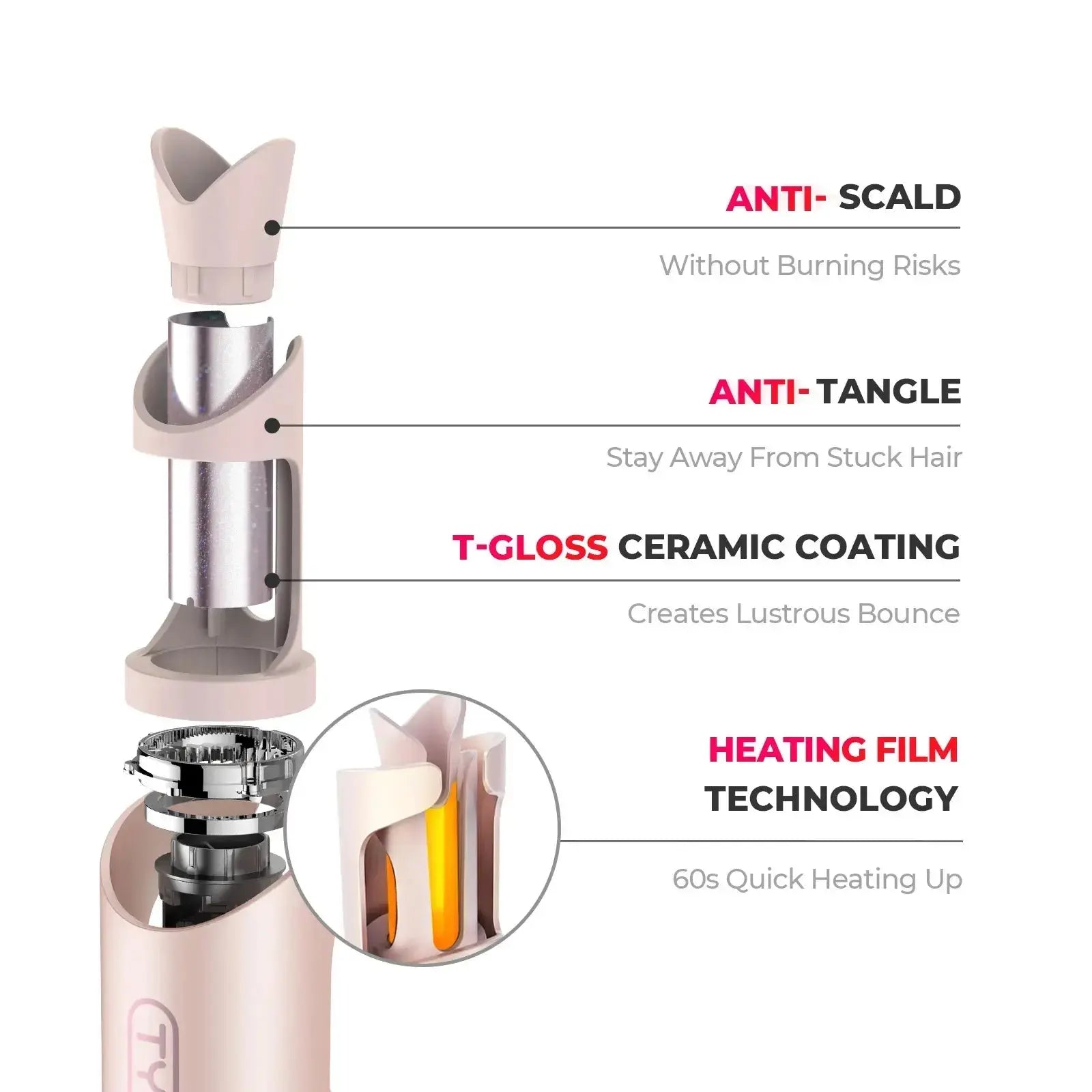 Transform your styling routine with FLOAMMI CURLGO PINK EDITION 1 Inch Cordless, and corded Automatic Curling Iron. With a cordless design and dual voltage compatibility, it's the perfect travel essential. Powered by a massive 7000 mAh battery, offers up to 60 minutes of cord-free styling.  T-GLOSS ceramic coating and 200 million negative ions create long-lasting, salon-quality results. Effortlessly create stunning curls anytime, anywhere with the perfect blend of style, innovation, and convenience.